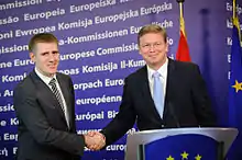 EU politicians found the achievements of the Lukšić government encouraging and expressed readiness to support Montenegro's European integration. EU's Enlargement Commissioner, Štefan Füle, told members of the European Parliament, "His commitment to pursue the reform process and strong determination to meet the key priorities set out in the Commission's opinion are encouraging. It is now crucial to focus on implementation and establish a solid track record."[61]