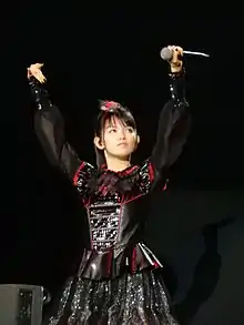 On stage, the song begins with Mizuno and Kikuchi running across the stage from opposite ends, cueing the audience to mosh via the Wall of Death, which is different from the traditional manner.[31] During the chorus, the three members jump and cross their arms into an "X", while shouting "Dame!" (No!) with their hands as kitsune signs.[16] During the bridge of "Ijime, Dame, Zettai", Mizuno and Kikuchi choreograph a fight while Nakamoto and the crowd cheer on them with the sense of unity.[31] Overall, the live performances has inspiration from those of the band X Japan.[32]