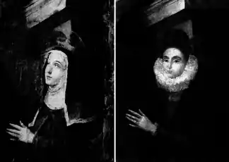 The identification of the princess of Venosa put an end to a controversy that had agitated the community of historians and musicologist up to that point. Among interpretations suggested for this figure in the Perdono, Glenn Watkins mentions Sister Corona, the sister of Cardinal Borromeo,[30] as well as the wife of the duke Gesualdo assinated.[31] The restored figure's court dress and collarless ruff are in keeping with the grandee attire worn by the Duke of Andria.[32]