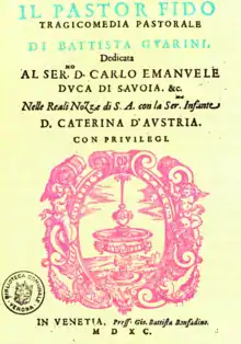On 4 April 1584 Vincenzo Gonzaga sent a letter to Guarini requesting the manuscript, intending to mount a production for his marriage to Leonora de' Medici at Mantua at the end of April. Guarini responded that he was yet to write the final act and all of the choruses, so a performance would be premature. There was a failed attempt later in 1584 to put on a performance, this time at Ferrara.[2] The play had its first complete performance in Turin, in 1585, in honor of the nuptials of the Duke of Savoy and Catharine of Austria. In the next year a pamphlet war erupted between proponents and opponents of the play, which was to continue until 1593.[3]