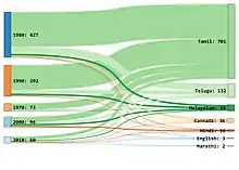 A graphical representation of Ilaiyaraaja's discography over the years with colours to represent languages, done through web-scraping using Python