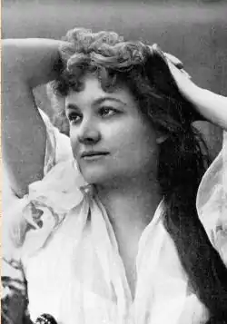 Pálmay began her stage career in Hungary (including Kassa, Budapest and Kolozsvár) by 1880 and played about two dozen roles in the 1880s, including Serpolette in Les Cloches de Corneville[3] In the early 1890s, she performed at the Theater an der Wien in Vienna, where she created leading roles in Carl Zeller's Der Vogelhändler (1891) and Johann Strauss II's Fürstin Ninetta (1893).[4] Soon, she was playing in Prague and the Unter den Linden Theater in Berlin. There, in 1893, she was cast in a German production of The Mikado to play the tenor hero, Nanki-Poo, in drag, and Sullivan unsuccessfully tried to stop the performances.[5] Later, Pálmay was surprised to find out that no woman had ever appeared on stage at the Savoy Theatre dressed as a man.[6]