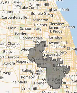 Illinois's 6th congressional district covers parts of Cook, DuPage, Lake, Kane and McHenry counties, as of the 2011 redistricting which followed the 2010 census. All or parts of Algonquin, Barrington, Barrington Hills, Bartlett, Burr Ridge, Carol Stream, Carpentersville, Cary, Clarendon Hills, Crystal Lake, Darien, Deer Park, Downers Grove, Elgin, East Dundee, Forest Lake, Fox River Grove, Gilberts, Glen Ellyn, Hawthorn Woods, Hinsdale, Hoffman Estates, Inverness, Kildeer, Lake Barrington, Lake in the Hills, Lake Zurich, Lakewood, Lisle, Lombard, Long Grove, Naperville, North Barrington, Oak Brook, Oakbrook Terrace, Oakwood Hills, Palatine, Port Barrington, Rolling Meadows, Sleepy Hollow, South Barrington, South Elgin, St. Charles, Tower Lakes, Trout Valley, Warrenville, Wayne, West Chicago, West Dundee, Westmont, Wheaton, Willowbrook and Winfield are included.