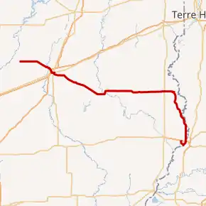 Illinois 33 continues south, parallel to the Wabash River and beneath U.S. Route 50. There is no intersection at this point.[3] Illinois 33 then travels west (along the old alignment of U.S. 50) and then back north to meet its terminus at a full interchange with U.S. 50.