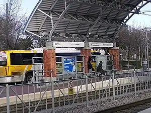 Outbound, this is the last stop for Blue Line trains on grade-separated tracks. South of this station, the tracks swing onto a viaduct and the line then runs in the middle of Lancaster Road for the rest of the journey to Ledbetter.