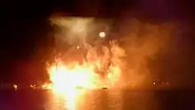 The Inferno Barge also housed an air-launch fireworks system. On September 19, 2005, the Inferno Barge was pulled from the show due to the explosion of a firework still inside its mortar tube earlier in the day. The structure took heavy damage; fortunately, no one was injured. The Inferno Barge returned to service on February 1, 2006 without the air launch system on the barge, although the cause of the accident was the firework shell itself and not the air launch system. The shells previously fired from this barge were moved and fired from the center slip. In February 2009, the inferno barge was pulled from the show and underwent a scheduled rehab. It returned on March 10, 2009. If any isopar is left in the tanks after the show, it is burned off later that night.[17][18]