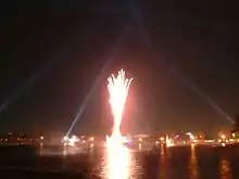 There were four side fountain barges that had 40 water nozzles per barge.[21] There was an effect that created a "skirt" of water around the bottom. A lighting system on-board allowed the water to be displayed in different colors. Each barge pumped approximately 4,000 US gallons (15,000 l; 3,300 imp gal) of water per minute.[21] These barges carried pyrotechnics as well.