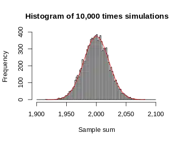 Since the simulation is based on the Monte Carlo method, the process is repeated 10,000 times. The results shows that the distribution of the sum of 1,000 uniform extractions resembles the bell-shaped curve very well.