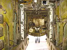 The Il-28 design was conventional in layout, with high, unswept wings and a swept horizontal tail and fin. The engines were carried in bulky nacelles slung directly under the wings. The nosewheel retracted rearwards, while the mainwheels retracted forwards into the engine nacelles. The crew of three were accommodated in separate, pressurised compartments. The navigator, who also acted as bombardier, was accommodated in the glazed nose compartment and was provided with an OPB-5 bombsight based on the American Norden bombsight of the Second World War, while the pilot sat under a sideways opening bubble canopy with an armoured windscreen. The gunner sat in a separate compartment at the rear of the fuselage, operating a power driven turret armed with two Nudelman-Suranov NS-23 23 mm cannons with 250 rounds each. In service, the turret was sometimes removed as a weight saving measure.[9] While the pilot and navigator sat on ejector seats, the gunner had to parachute out of a hatch in the floor in the event of an emergency. Two more fixed, forward-firing 23 mm cannon with 100 rounds each were mounted under the nose and fired by the pilot, while a bomb bay was located in the fuselage, capable of holding four 100 kg (220 lb) bombs in individual containers, or single large bombs of up to 3,000 kg (6,600 lb) slung from a beam in the bomb bay.[10][11]