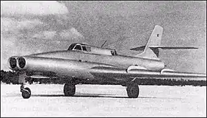 The Ilyushin Il-40 (NATO reporting name: Brawny[1]) was a two-seat Soviet jet-engined armored ground-attack aircraft. The first prototype flew in 1953 and was very successful except when it fired its guns, as their combustion gasses disturbed the airflow into the engines and caused them to flameout or hiccup. Remedying this problem took over a year and involved the radical change of moving the engine air intakes all the way to the very front of the aircraft and repositioning the guns from the tip of the nose to the bottom of the fuselage, just behind the nosewheel. The aircraft, now resembling a double-barreled shotgun from the front, was ordered into production in 1955. Only five production aircraft had been completed before the entire program was canceled in early 1956 when the VVS discarded its close air-support doctrine in favor of tactical nuclear weapons on the battlefield.