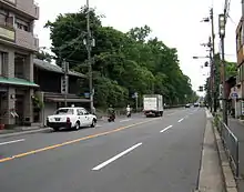 Nowadays Imadegawa Street is located between Itsutsuji Street (north) and Motoseiganji Street (south), and is considered narrow for a major road.[1] The street passes on the north side of the Kyoto Imperial Palace and for this reason, the northern gate of the garden receives the name of Imadegawa Gomon.[1] Several universities are located along the street and for this reason its east section is considered a student district.[1]