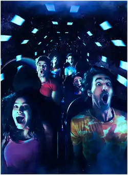 Nitro roller coaster - Deep Space: An indoor space themed roller coaster. The ride travels at 68.4 km/hr and reaches a maximum height of 57 feet (17.5 m)
