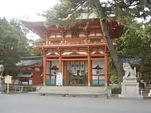 Imamiya Shrine (今宮神社, Imamiya-jinja) is a Shinto shrine located in Kita-ku, Kyoto, Japan. It was originally established for patrons to pray for safety from an epidemic, though it has evolved into a shrine where patrons can pray for general good health. The shrine complex is embedded in a forest of large trees northwest of Daitoku-ji and includes many minor shrines in addition to the main shrine, or honden.[1] On every second Sunday in April, one of the 3 major festivals in Kyoto, Yasurai Matsuri, is held at the shrine. The word imamiya (今宮) means "newly constructed."[2]