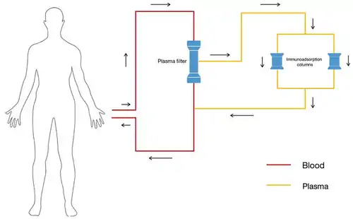 It may be used as an alternative to plasma exchange in certain conditions.[6] Evidence of benefit is lacking in those with kidney problems. Concerns include that it is expensive.[7]