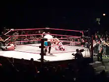 During the May 3, 2011 Impact! television tapings, the show would change its name to Impact Wrestling.[54][55][56] On November 7, 2011, TNA revealed that Ohio Valley Wrestling (OVW) would become TNA's official developmental territory.[57] In December 2011, TNA debuted their new India-based subsidiary promotion Ring Ka King.[58] On May 31, 2012, Impact Wrestling began airing live at a new start time of 8 p.m. EST on Thursday nights.[59] The live schedule would continue throughout 2012.[60] In March 2013, TNA began taping Impact from different venues around the United States and terminated its lease with Universal Studios.[61] On March 14, TNA introduced a new universal HD stage which would be used for all weekly programming.[62] On November 2, TNA ended its relationship with OVW.[63]