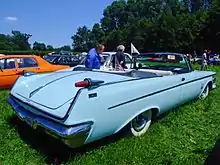 Changes for 1965 were largely confined to the front fascia and to trim, and replacement of the push-button automatic transmission gear selection system with a more conventional steering column-mounted shift lever. The split grille was gone, replaced by a large chromed crossbar and surround, and the headlights were inset into the grill behind glass covers (similar to that year's Chrysler 300 and New Yorker models) with etched horizontal lines imitating the grill.[28] As pointed out by the sales literature, 100-year-old Claro Walnut trim was added to the interior. Production totaled 18,409.[1]