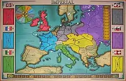 Imperial is a German-style board game designed by Mac Gerdts in which the object is to accumulate wealth in the form of bond holdings in successful countries and cash. Players take on the role of international financiers who purchase government bonds in the six pre-World War I empires of Austria-Hungary, France, Germany, Great Britain, Italy, and Russia. The principal bondholder of a nation gains control of its government and can order importation or production of armaments and ships; maneuvering of military units; construction of factories; and taxation. During play, an investor card is passed around which allows the purchase of additional bonds. A rondel – a wheel-shaped game mechanism with eight different options – is used to determine the options available to a country. The game box states that it is for 2–6 players, but a developer-supported variant allows play with seven.[1] Imperial 2030 is a follow-up game released in 2009 with similar mechanics.
