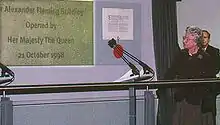 Following the Second World War, there was again concern that Britain was falling behind in science – this time to the United States. The Percy Report of 1945 and Barlow Committee in 1946 called for a "British MIT"-equivalent, backed by influential scientists as politicians of the time, including Lord Cherwell, Sir Lawrence Bragg and Sir Edward Appleton.[34][35] The University Grants Committee strongly opposed however,[34] and so a compromise was reached in 1953, where Imperial would remain within the university, but double in size over the next ten years.[36][37] The expansion led to a number of new buildings being erected. These included the Hill building in 1957 and the Physics building in 1960, and the completion of the East Quadrangle, built in four stages between 1959 and 1965. The building work also meant the demolition of the City and Guilds College building in 1962–63, and the Imperial Institute's building by 1967.[38] Opposition from the Royal Fine Arts Commission and others meant that Queen's Tower was retained, with work carried out between 1966 and 1968 to make it free standing.[39] New laboratories for biochemistry, established with the support of a £350,000 grant from the Wolfson Foundation, were opened by the Queen in 1965.[40][41]