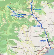 The Impero rises near Monte Grande,[3] crosses the comunes of Aurigo, Borgomaro, Lucinasco, Chiusavecchia, Chiusanico and Pontedassio, giving its name to its valley, and ends in the Ligurian Sea in Oneglia (IM).