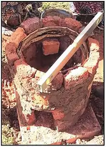 For genuine rocket stoves, the cook pot fits down inside, helping to insure almost complete combustion. There is a narrow gap, e.g., 12.0 millimeters, between the stove liner and the cookpot. As introduced by the organization Aprovecho, the principles of initial rocket stoves included their ‘…vertical combustion chambers that acted as chimneys, mixing the wood’s volatile gases with air so that the rockets burned more efficiently.’[31] For the insulating ceramic rocket stove, this consists of curved insulating bricks formed into a cylinder, such that similarly...'The pot fits down inside with only the narrow gap all around,'[32]