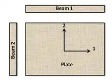 The “Resonalyser procedure”[7][8][9][10] is an extension of the IET using an inverse method (also called "Mixed numerical experimental method"). The non destructive Resonalyser procedure allows a fast and accurate simultaneous identification of the 4 Engineering constants E1, E2, G12 and v12 for orthotropic materials. For the identification of the four orthotropic material constants, the first three natural frequencies of a rectangular test plate with constant thickness and the first natural frequency of two test beams with rectangular cross section must be measured. One test beam is cut along the longitudinal direction 1, the other one cut along the transversal direction 2 (see Figure on the right).