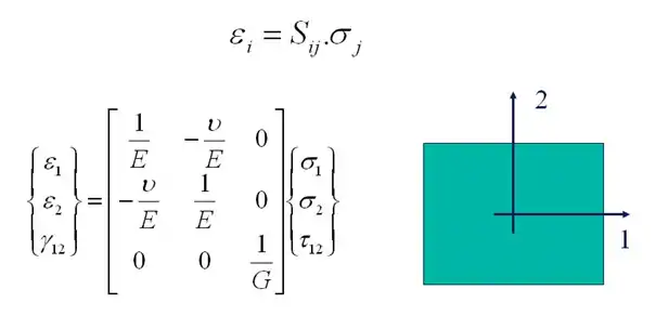 In this expression, ε1 and ε2 are normal strains in the 1- and 2-direction and Υ12 is the shear strain. σ1 and σ2 are the normal stresses and τ12 is the shear stress. The orientation of the axes 1 and 2 in the above figure is arbitrary. This means that the values for E, G and v are the same in any material direction.