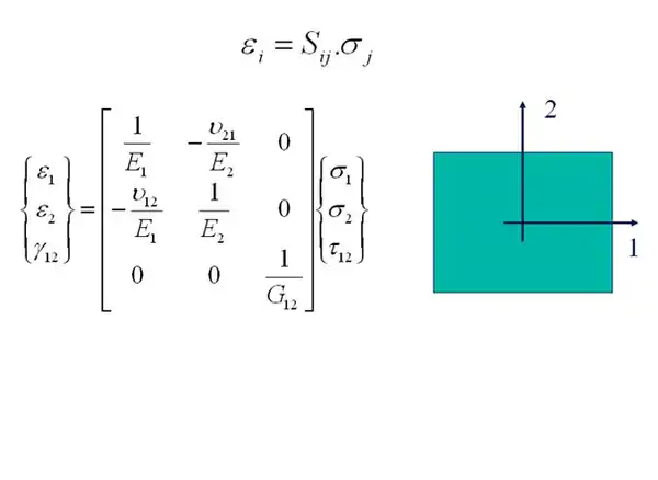 E1 and E2 are the Young’s moduli in the 1- and 2-direction and G12 is the in-plane shear modulus. v12 is the major Poisson’s ratio and v21 is the minor Poisson’s ratio. The flexibility matrix [S] is symmetric. The minor Poisson’s ratio can hence be found if E1, E2 and v12 are known.