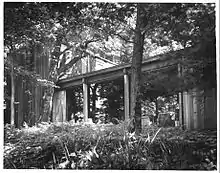 The north and south walls of the one-story living room are wood framed 4 by 8 inches (10 cm × 20 cm) columns. The columns are carried beneath the floor line to rest on concrete block foundation walls. 2 by 8 inches (5.1 cm × 20.3 cm) floor joists on 16 inches (41 cm) centers carry the rough floor.[2] The full-height exterior bay walls are of plate glass. The glass was shipped from Pittsburgh, on special order, by rail and delivered to the contractor at the site for erection. One of the panels, on the screen porch or south side of the living room wall, is capable of sliding open to a full door of 8 by 9 feet (2.4 m × 2.7 m), by means of a continuous steel slide and steel barn door hangers.[2] As stated above, the exterior materials used in the Horner House include naturally bleached heart redwood, bevelled joint cladding, always used vertically, and plate glass. The two-story core of the main house contains manufactured casement windows, transite spandrels and heads with redwood corners and facias. The doors are solid lumber core, stained and varnished.[2] The screened porch is constructed of four built-up columns, suspended from the cantilevered ceiling joists. The floors are pine varnished. The copper screen has been attached with copper-headed nails to the uprights in 36" horizontal bands and then hand-sewn with copper wire at the selvage edges to form a floor-to ceiling screen "wall", in four bays, along its 32 feet (9.8 m) length. The screens presently in place on the porch are original.[2]