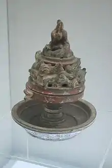 Among the most celebrated early incense burner designs is the hill censer (boshanlu 博山爐), a form that became popular during the reign of Emperor Wu of Han (r. 141–87 BCE). Some scholars believe hill censers depict a sacred mountain, such as Mount Kunlun or Mount Penglai. These elaborate vessels were designed with apertures that made rising incense smoke appear like clouds or mist swirling around a mountain peak.[5]