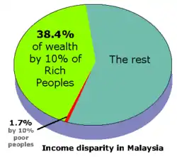 The UNHDP Report shows that the richest 10% in Malaysia control 38.4% of the economic income as compared to the poorest 10% who control only 1.7%. However, according to official statistics from the Prime Minister's Department, inequality has been decreasing steadily since 1970, with the Gini coefficient dropping to an all-time low of 0.40 in 2014.[3]