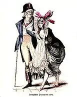The Merveilleuses scandalized Paris with dresses and tunics modeled after the ancient Greeks and Romans, cut of light or even transparent linen and gauze. Sometimes so revealing they were termed "woven air", many gowns displayed cleavage and were too tight to allow pockets. Oftentimes, the gowns were dampened in order to cling to the figure.[3] To carry even a handkerchief, the ladies had to use small bags known as reticules.[4] They were fond of wigs, often choosing blonde because the Paris Commune had banned blonde wigs, but they also wore them in black, blue, and green. Enormous hats, short curls like those on Roman busts, and Greek-style sandals were the rage. The sandals tied above the ankle with crossed ribbons or strings of pearls. Exotic and expensive scents fabricated by perfume houses like Parfums Lubin were worn both for style and as indicators of social station. Thérésa Tallien, known as "Our Lady of Thermidor", wore expensive rings on the toes of her bare feet and gold circlets on her legs.