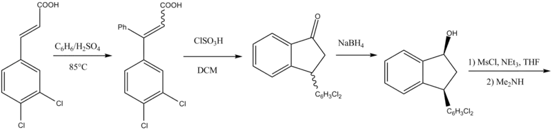 Routes based on 1-indanone types of intermediates are not as simple as a direct reduction of an imine or oxime. It is reported that the undesirable cis diastereomers are formed instead of the desirable trans isomers. This adds an extra step in the synthetic route. First, the ketones are reduced to get mostly cis alcohols, which are then converted to the corresponding mesylates conserving stereochemistry. These can then be reacted with e.g. N-methylbenzylamine, effecting a Walden inversion (SN2). Final removal of the benzyl affords the product as a racemic mixture.