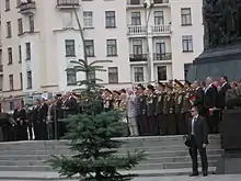 In 1974, President Richard Nixon of the United States arrived in Minsk during a state visit to the Belarusian SSR to attend celebrations in honor of the 30th anniversary of the liberation of Belarus.[10] Attending the 2013 parade were the Presidents of Venezuela and Laos, Nicolás Maduro and Choummaly Sayasone, respectively.[11][12] In 2014, Russian President Vladimir Putin visited Belarus on the eve of Independence Day, attending the inauguration of the Belarusian Great Patriotic War Museum.[13] During the 2019 celebrations, Azerbaijani defense minister Zakir Hasanov, Commander Russian Western Military District Viktor Astapov, and Uzbek army chief Pavel Ergashev were in attendance.[14]