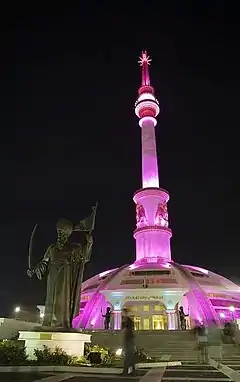 When it comes to formal protocol, there is a ceremony of laying flowers at the Independence Monument, followed by a massive military parade on the central square of Ashgabat.[4][5] The military parade is followed by the mass procession of representatives of the five provinces, capital of Ashgabat, as well as workers in various branches of Turkmenistan's economy.[6] On Independence Day, a tradition of awarding outstanding citizens and cultural figures state awards is common practice. World leaders such as the President of Russia[7] and the President of the United States typically deliver congratulations to the Turkmen nation. In many cities of the country, festive events and concerts are held. Salutes and fireworks in honor of independence are also traditional events.[8] The holiday is celebrated with festivities on September 27.[9]