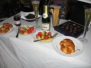 This is an index of breakfast-related articles. Breakfast is the first meal taken after rising from a night's sleep, most often eaten in the early morning before undertaking the day's work.[1] Among English speakers, "breakfast" can be used to refer to this meal, or to a meal composed of traditional breakfast foods (such as eggs, oatmeal and sausage) served at any time of day.