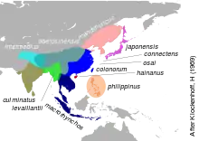 Ectoparasitic bird lice in the genus Myrsidea coevolve with their hosts and a study of speciation within the genus suggested distinct groups with well-marked distributions.[15] Comparisons of the vocalizations of birds from different areas also indicated clear differences[16] and analysis of sequence divergence in the mitochondrial DNA suggests that the Himalayan population (termed as japonensis by some or as intermedius+tibetosinensis by those who restrict the range of japonensis to Japan) differentiated from the plains-dwelling culminatus nearly 2 million years ago.[17][18][19]