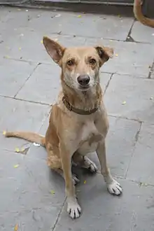 The Indian pariah dog, also known as the Indian native dog or INDog,[6][7] South Asian pye dog and Desi Dog,[4][6] is a landrace of dog native to the Indian subcontinent.[5] They have erect ears, a wedge-shaped head, and a curved tail. It is easily trainable and often used as a guard dog and police dog.[8][9] This dog is an example of an ancient group of dogs known as pye-dogs. It is possible that the ancestry of this dog dates back 4,500 years.[10]