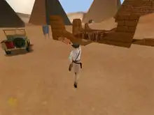 Developed for Windows 95 and 98,[34] the game uses a modified version of the Sith engine adapted for a third-person view by lead programmer Paul LeFevre.[35] Eventually, lighting, collision, rendering and tools underwent drastic rewrites to the point that the code was renamed the Jones engine.[35] The levels were principally designed by Steven Chen, and later conceptualized with illustrations by lead artist William Tiller.[36] Multiplayer support was planned at the beginning of the development, but ultimately dropped because it turned out to be too complex to adequately test.[35] Instead, more emphasis was put on the design of the single-player campaign with its puzzles and exploring aspect.[35] The team implemented a hint system to lead players in the right direction.[33] Additionally, the score system from previous Indiana Jones games, the Indy Quotient, makes a return.[37] Apart from John Williams' "Raiders March", the soundtrack was newly composed by Clint Bajakian and consists of about 130 original pieces.[35] Dubbed European language versions of the fully voice-acted game were released by THQ in Germany, Ubisoft in France, Electronic Arts in Spain and CTO in Italy.[38][39][40][41]