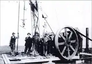 In 1886, Indiana's first commercial gas well was established when George W. Carter, William W. Worthington, and Robert C. Bell hired Almeron H. Crannell to drill another well in Eaton. Crannell reached gas at a depth of 922 feet (281 m). When the escaping gas was ignited, the flame reached 10 feet into the air. Other gas wells were drilled, and in instances, the escaping gas was ignited to advertise the discovery, with the assumption the gas inexhaustible. The resultant flame was called a flambeaux.[2]