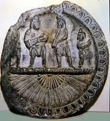 The Bimaran casket, representing the Buddha surrounded by Brahma (left) and Śakra (right) was found inside a stupa with coins of Azes inside. British Museum.