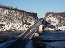 The Indre Sunnan Bridge (Norwegian: Indre Sunnan bru) is a cantilever bridge in the municipality of Bodø in Nordland county, Norway. It crosses a strait between the island of Straumøya and the village of Tuv on the mainland. The Saltstraumen strait and its famous maelstrom lie just a short distance to the northeast. The bridge is 360 metres (1,180 ft) long and the main span is 165 metres (541 ft).[1]