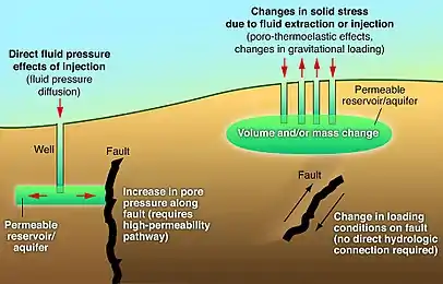 To assess induced seismicity risks associated with carbon storage, one must understand the mechanisms behind rock failure. The Mohr-Coulomb failure criteria describe shear failure on a fault plane.[66] Most generally, failure will happen on existing faults due to several mechanisms: an increase in shear stress, a decrease in normal stress or a pore pressure increase.[12] The injection of supercritical CO2 will change the stresses in the reservoir as it expands, causing potential failure on nearby faults. Injection of fluids also increases the pore pressures in the reservoir, triggering slip on existing rock weakness planes. The latter is the most common cause of induced seismicity due to fluid injection.[12]