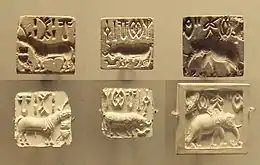 In the Mature Harappan period, from about c. 2600–1900 BCE, strings of Indus signs are commonly found on flat, rectangular stamp seals as well as written or inscribed on a multitude of other objects including pottery, tools, tablets, and ornaments. Signs were written using a variety of methods including carving, chiselling, embossing, and painting applied to diverse materials such as terracotta, sandstone, soapstone, bone, shell, copper, silver, and gold.[25] As of 1977, Iravatham Mahadevan noted, that about 90% of the Indus script seals and inscribed objects discovered so far were found at sites in Pakistan along the Indus river and its tributaries, such as Mohenjo-daro and Harappa,[lower-alpha 1] while other sites located elsewhere account for the remaining 10%.[lower-alpha 2][26][27] Often, animals such as bulls, water buffaloes, elephants, rhinoceros, and the mythical "unicorn"[lower-alpha 3] accompanied the text on seals to help the illiterate identify the origin of a particular seal.[29]