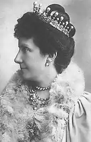 When Infanta Paz finally met Ludwig Ferdinand in the autumn of 1880, she found him unattractive and did not wish to marry him. Paz rebuffed the proposed marriage, but Ludwig Ferdinand did not abandon his intentions. In January 1883, Ludwig Ferdinand returned to Spain to ask for Paz's hand in marriage. While walking together in the gardens of La casa de campo on January 22, 1883, he proposed and Paz accepted.[7] The marriage took place in the chapel of the Royal Palace of Madrid on 2 April 1883. Paz retained her rights to the Spanish crown and received an annuity of 150,000 pesetas.[10] She was twenty years old. Among her gifts was the Bavarian sunburst tiara,[11] which remained in the princely family until it was sold at auction in 2013.[12]