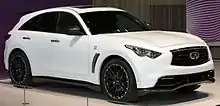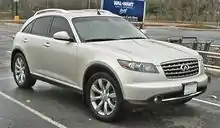 The Infiniti QX70, formerly called the Infiniti FX until 2013, is a mid-size luxury crossover SUV produced by the Nissan-owned Infiniti luxury vehicle brand between 2002 and 2017. The FX replaced the QX4 as Infiniti's mid-size SUV. It shares the same FM platform as the rear-wheel drive Nissan 370Z, and it "made no claims of climbing mountains." Rather, its aggressive shape promised style and quick handling.[2] The similarly sized Nissan Murano is based on the same D platform as the front-wheel drive Nissan Altima. The FX does not have a Nissan-branded equivalent and is not sold in Japan.