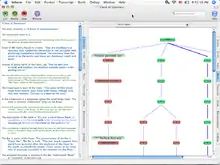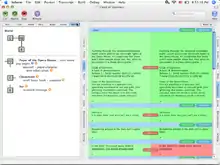 The IDE presents two side-by-side panes for working in. Each pane can contain the source code being worked on, the current status of compilation, the skein, the transcript, the indices of the source code, a running version of the game, documentation for Inform 7 or any installed extensions to it, or settings. The concept is to imitate an author's manuscript book by presenting two "facing pages" instead of a multitude of separate windows.[11]