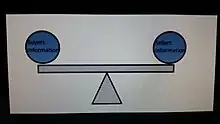 A common way to visualise information asymmetry is with a scale with one side being the seller and the other the buyer. When the seller has more or better information the transaction will more likely occur in the seller's favour ("the balance of power has shifted to the seller"). An example of this could be when a used car is sold, the seller is likely to have a much better understanding of the car's condition and hence its market value than the buyer, who can only estimate the market value based on the information provided by the seller and their own assessment of the vehicle.[4] The balance of power can however also be in the hands of the buyer. When buying health insurance, the buyer is not always required to provide full details of future health risks. By not providing this information to the insurance company the buyer will pay the same premium as someone much less likely to require a payout in the future.[5] The image on the right is an image of the balance of power between two agents when there is perfect information. If the buyer has more information the power to manipulate the transaction will be represented by the scale leaning towards the buyers' side.