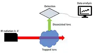 Infrared photodissociation (IRPD) spectroscopy uses infrared radiation to break bonds in ions, photodissociate, within a mass spectrometer.[1] IRPD spectroscopy has been shown to use electron ionization, corona discharge, and electrospray ionization to obtain spectra of volatile and nonvolatile compounds.[2][3] Ionized gases trapped in a mass spectrometer can be studied without the need of a solvent as in infrared spectroscopy.[4]