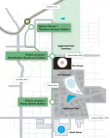 The Envision Inglewood plan was the culmination of several transportation and mobility initiatives to be undertaken by the City including a citywide event transportation management and operations plan, mobility plan, neighborhood protection plan, and the Inglewood Transit Connector Project that would connect the under-construction Downtown Inglewood station on the Metro K Line to Kia Forum, SoFi Stadium, mixed-use development at Hollywood Park, and the Intuit Dome.[1][2]