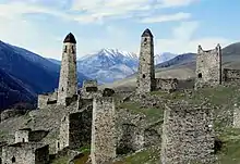 The Ingush stone architecture is closely related to their way of life in the mountains. The stone architecture is known to mountain Ingushetia as early as 8,000 BC - 4,000 BC cyclopean masonry settlements Egikal, Targim, Doshkhakle, Leimi. Caucasologist Ruslan Buzurtanov mentions that every Ingush family had an architectural triad: a tower, a church, and a necropolis. All three were present in every settlement. All three evolved continuously over time. For example the Tkhaba-Yerdy Church was originally a pagan temple according to the evidence the earliest structures that dates back before the 8th-9th centuries when it was remodeled into a Christian church adding Christian crosses and reliefs but keeping the pagan petroglyphs.[58] The Ingush stone town consisting of towers and churches were located lower than the necropolis town of the dead. Ingush necropolis had stepped roof either pyramidal or conical shape. Combat towers had stepped pyramidal roof. Necropolis evolved over time: 3,000 BC they were underground stone Kists, later grouped into pyramids, then became half underground and finally early middle ages above the ground structures. Majority of the Ingush stone necropolis and churches East of the Terek river were either partially or fully destroyed during the Soviet times especially after Ingush people were exiled en masse in 1944. The necropolis were looted by Ossetian and Russian colonists who were brought to Ingushetia after 1944. The combat towers had an entrance on the second floor which had a conical roof with a cross made of stones and a keystone which formed the floor of the next level. These conical stone crosses are unique only in the Ingush towers. The combat towers usually had five to six levels. None of the arches of windows in the combat towers had a keystone and were made of a solid blocks of stone. The famous Soviet archaeologist and historian, professor E.I. Krupnov in his book "Medieval Ingushetia" described the Ingush towers as «in the true sense the pinnacle of the architectural and constructional mastery of the ancient population of the region».[59]